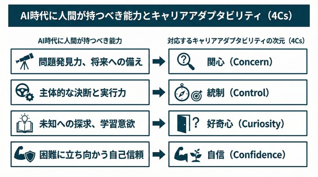 AIの進化が進む中で、人間に求められる強みとして、キャリアアダプタビリティの4つの次元は重要性が高まっていると指摘されることが多くなっています。