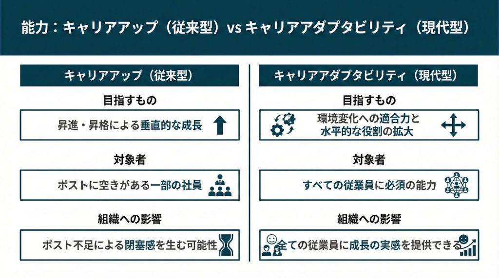 しかし、それぞれは機能や射程が異なる別の枠組みであり、違いを押さえることで、なぜキャリアアダプタビリティが現代の組織や個人にとって重要な“資源”とされるのかが、より明確になります。