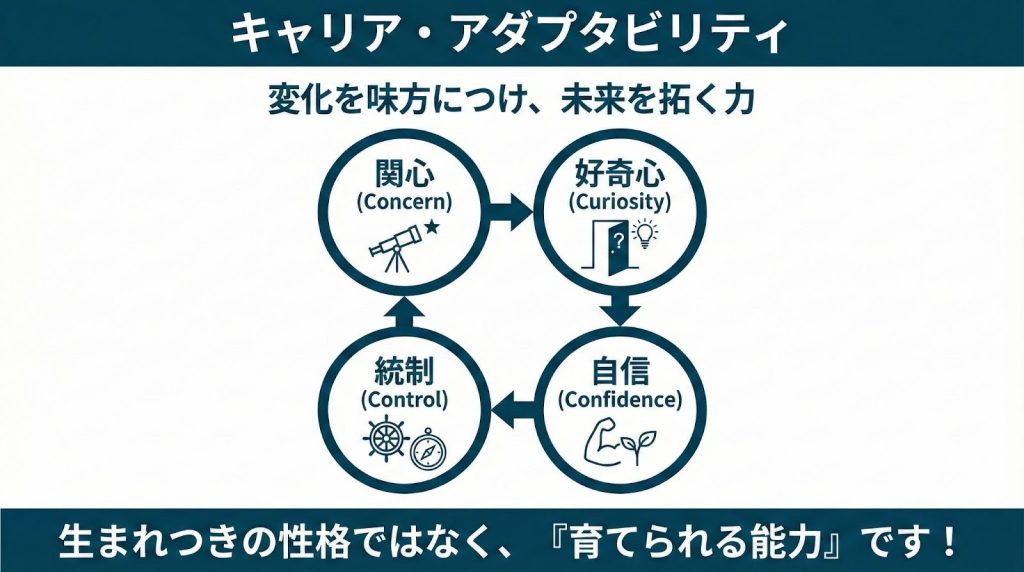 キャリア構成理論(Career Construction Theory)では、アダプタビリティは「関心(Concern)」「統制(Control)」「好奇心(Curiosity)」「自信(Confidence)」という4つの資源(4Cs)から構成され、将来への準備や探索、自己調整を可能にする枠組みとして位置づけられています。